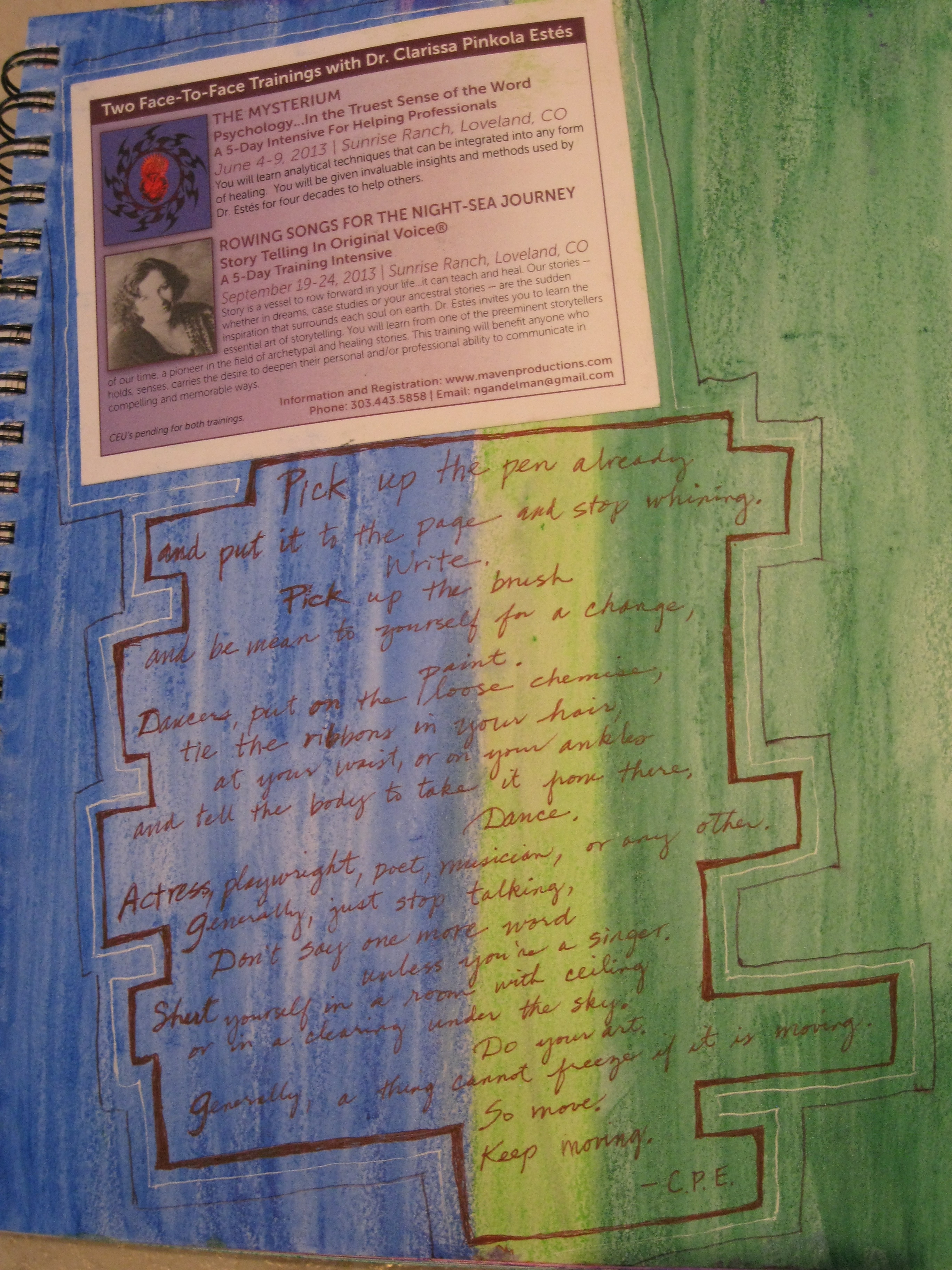 In my post to you last week I forgot to tell you of two somewhat momentous events that occurred during my “pilgrimage” to learn from CPE, that is,  Dr. Clarissa Pinkola Estes.  One is quite wonderful, the other, not wonderful at all.