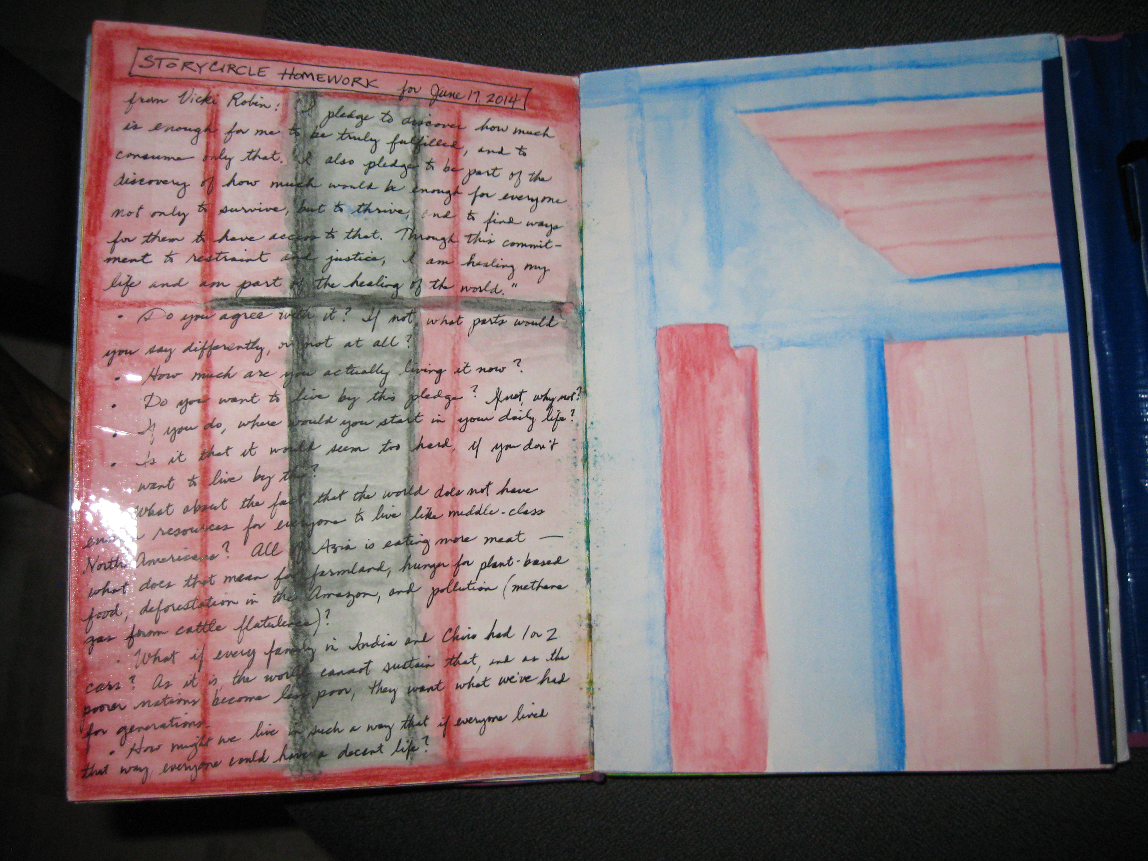 My journals are like scrapbooks, too, in that I glue in notes from others or daily life ephemera.  For several years I did more traditional photo-scrapbooking.  I like that, too, but that’s in a different category for me.  The photo-scrapbooks were made for other people’s eyes, whereas my journals are made for me.  I put in whatever pleases me, whether it’s “beautiful” or “perfect” or not.  And if I don’t like how a page turns out, I don’t tear it out or destroy it; I just turn the page and start again.  That’s also how I try to do life:  move forward, turn the page and start again!