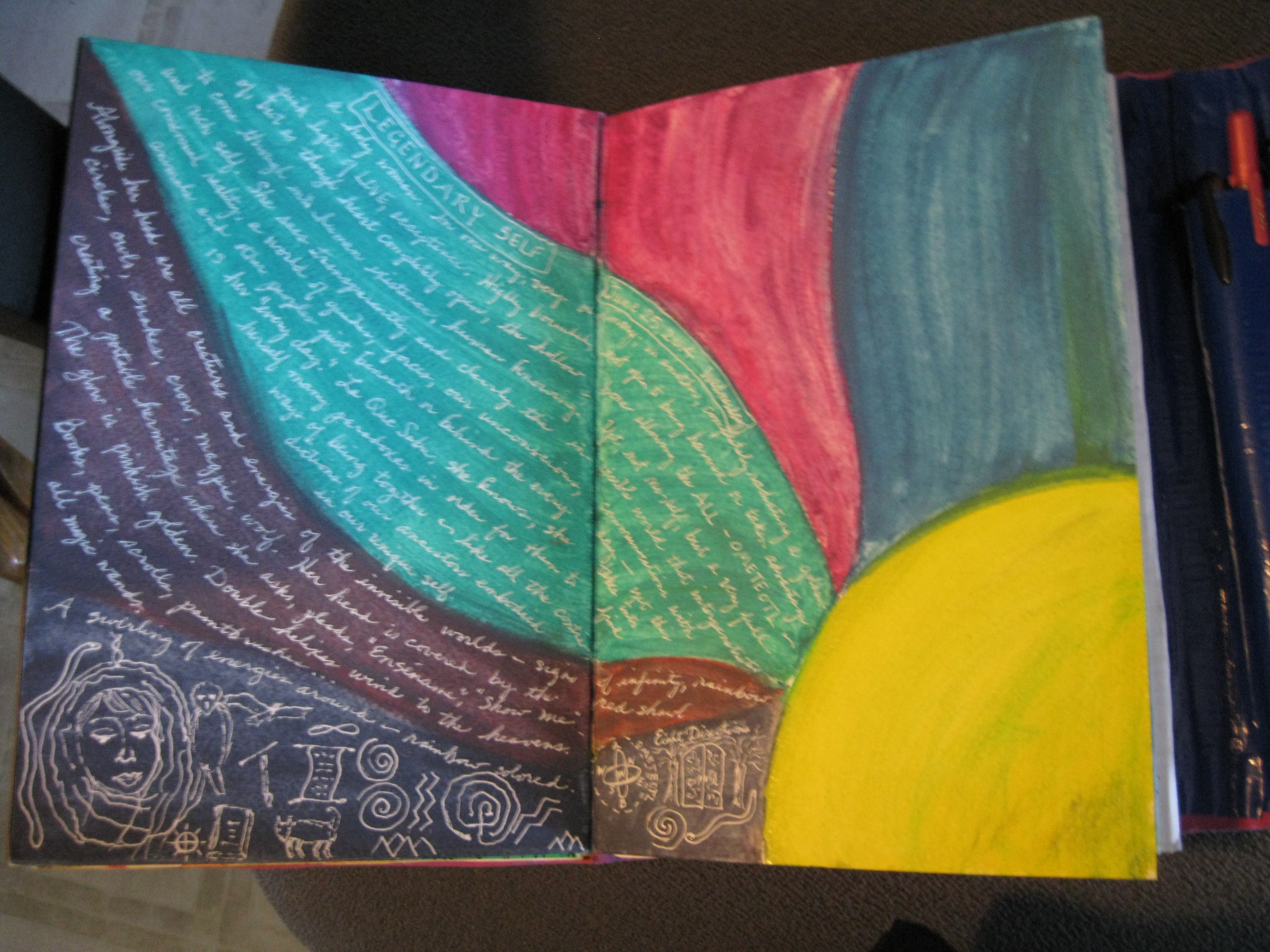 VERY IMPORTANT:  I don’t try to be perfect, or make it look particularly “beautiful”.  I find that way of thinking to be paralyzing.  I just aim to get some color on the page.  I let it dry, turn the page, and slap down more color.  I can always add more color, or add collage, or anything else that will spice it up, and I often do.  I love doing this —- the colored page invites me to write.  I journal almost every day, and often add a sentence or two at several times during the day.  My journals are not expensive, so I don’t worry about “ruining” a page.  I just go for it, and some pages ARE better than others (as you can see from the ones I’ve included here).