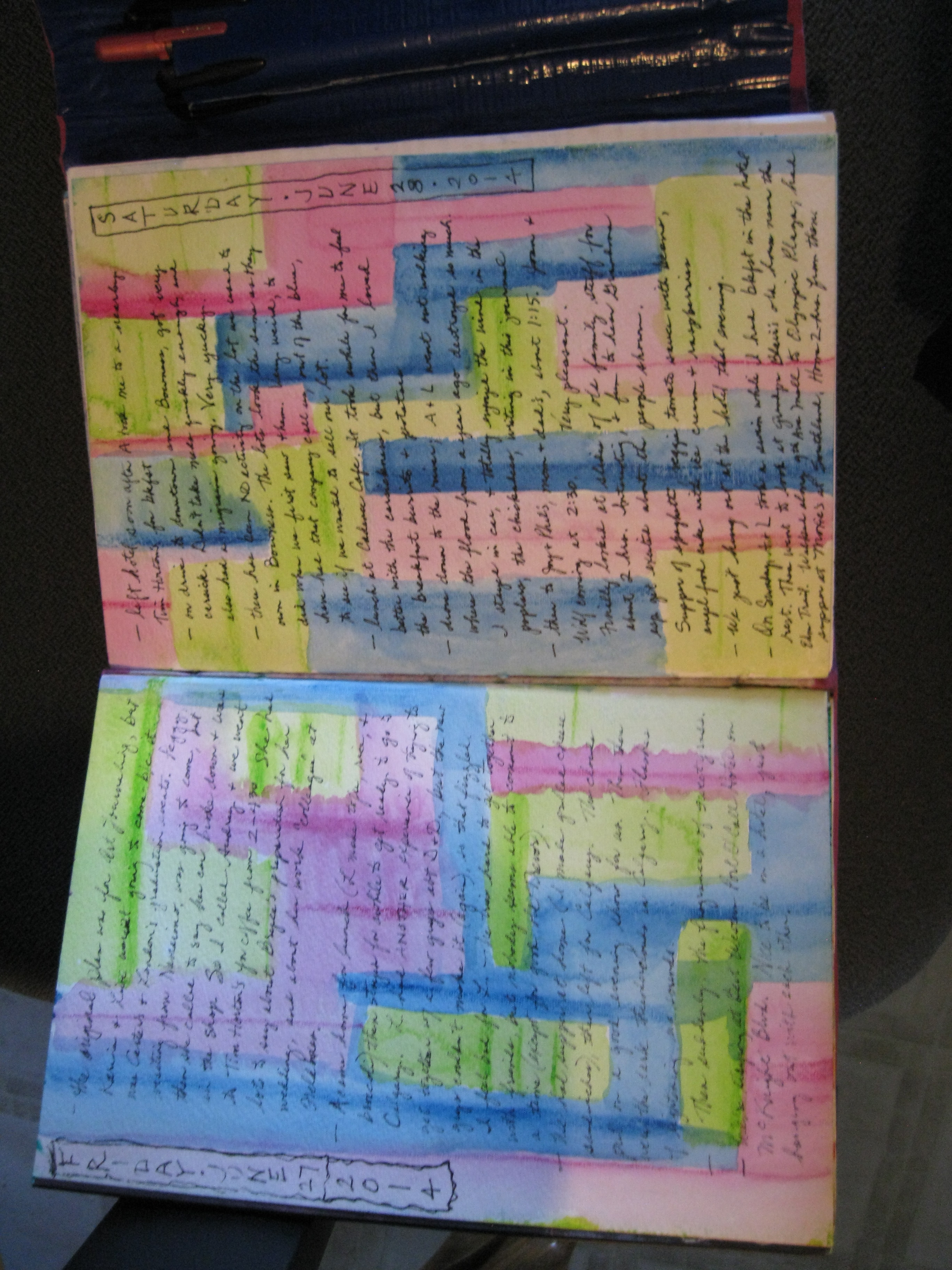 When I use acrylics in my journal, as I do when I’m doing more “arting” rather than writing, or when I’m doing a collage or mixed media page, I find it tricky to write over the paint.  It can be done, for sure, but you have to have the right pen, and it’s “lumpy”, i.e., difficult to write comfortably.  So I use watercolor paints most of the time in my journals because they are so easy to write on.  I go through the book and paint pages before I need them.  Then they’re ready for when I write.  Mostly I use 2 or at most 3 colors on the 2 page spread, and keep it either plain, or use larger squares and other shapes that would give me nice spaces to write in.  Some of the pages I include here have been made with watercolor pencils, just horizontal and vertical stripes.  When I then go over them with water and a brush, I bring the colors together to cover the whole page.