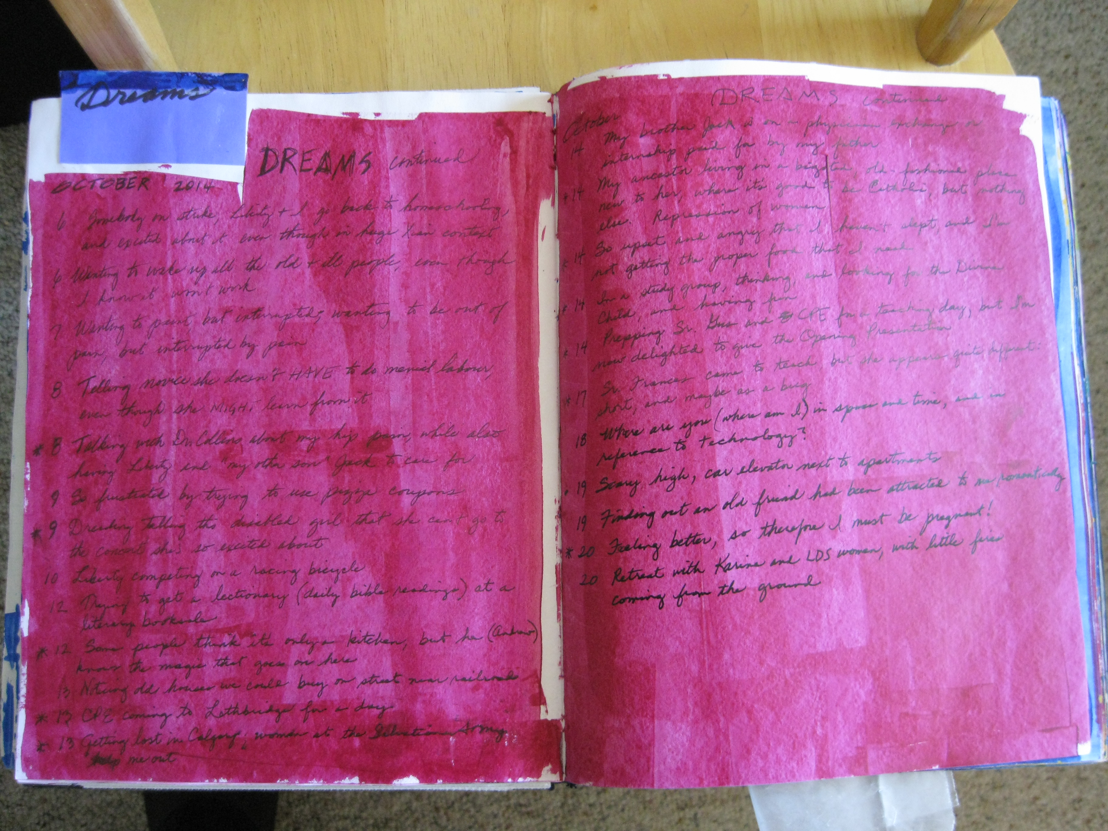 List a few times when you were visited by the unexpected (which might be either a serendipitous event, or a time when your plans just fell apart). Cover your words with colors that reflect emotionally the outcomes of those “unexpecteds”. Of course which colors you pick are unique to yourself —- I might pick blue because it reflects pleasant, peaceful, and expansive moments; you might use blue for the sadder consequences of unexpected events.
