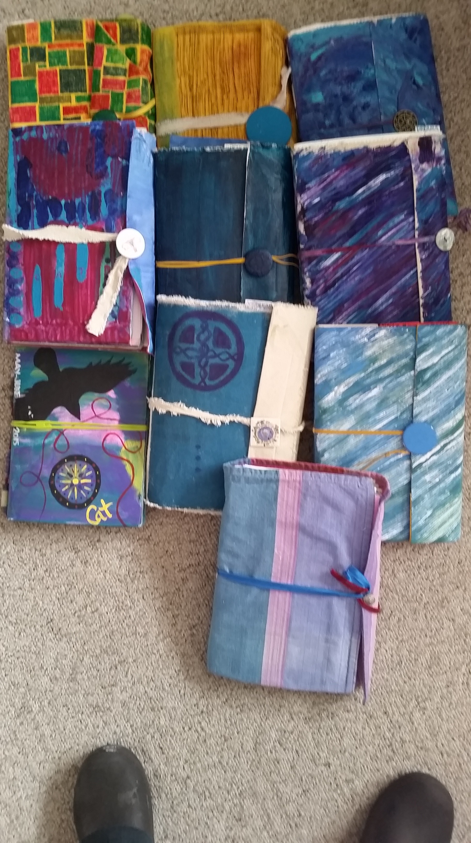 I also, surprisingly, filled these 10 journals with musings, lists, doodles, paintings, collage, print outs of memorable emails I sent or received, photos of my paintings and writings throughout the year, and an article or two I just couldn’t throw away.  As you can see, I make my own journals, sewing folded watercolor paper into fabric covers.  There’s one Cosmic Smashbook in there:  the one with the raven and compass painted on the cover is a decorated composition book.