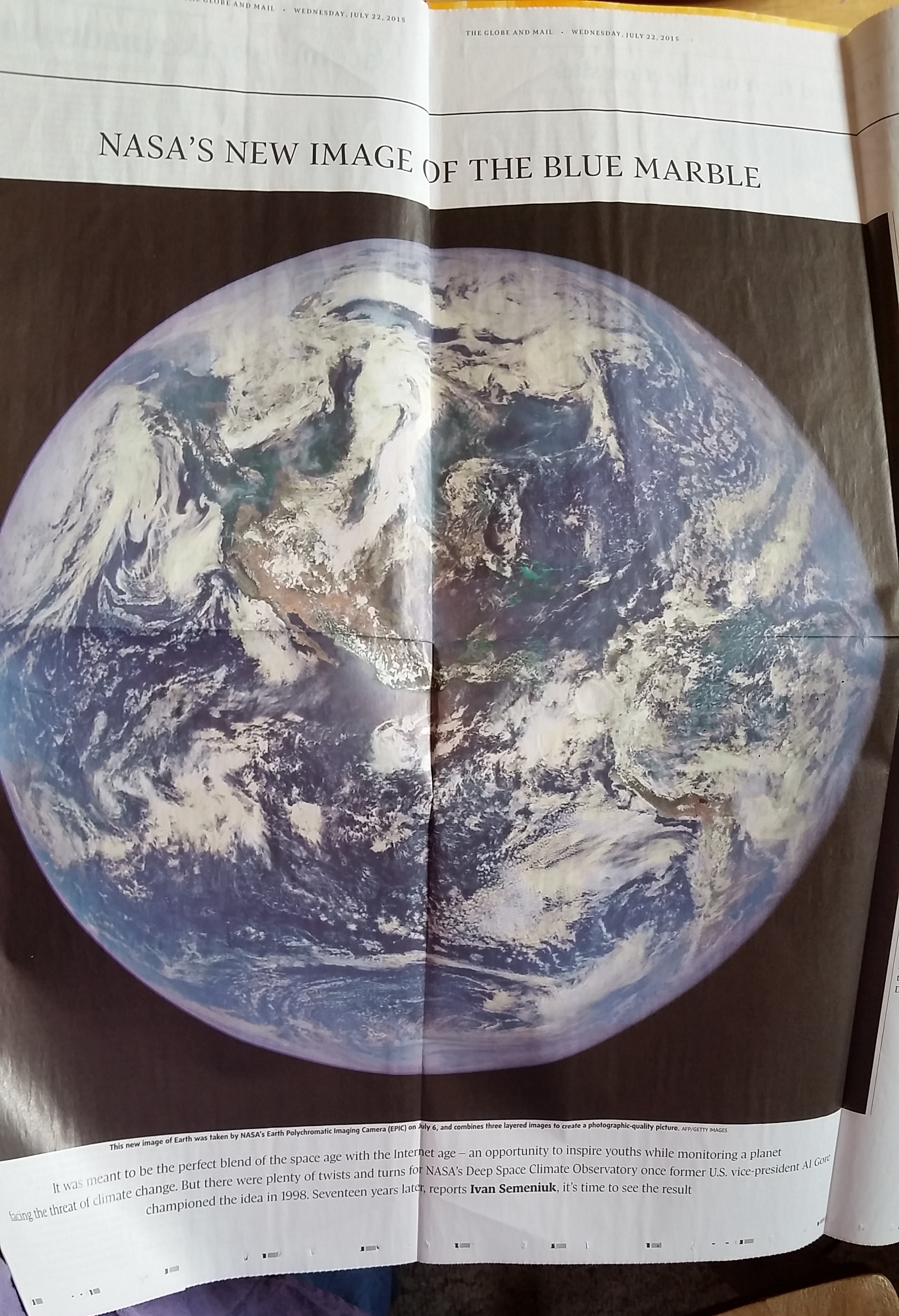 Newspaper clipping of a recent photo of the earth from a satellite launched years ago.