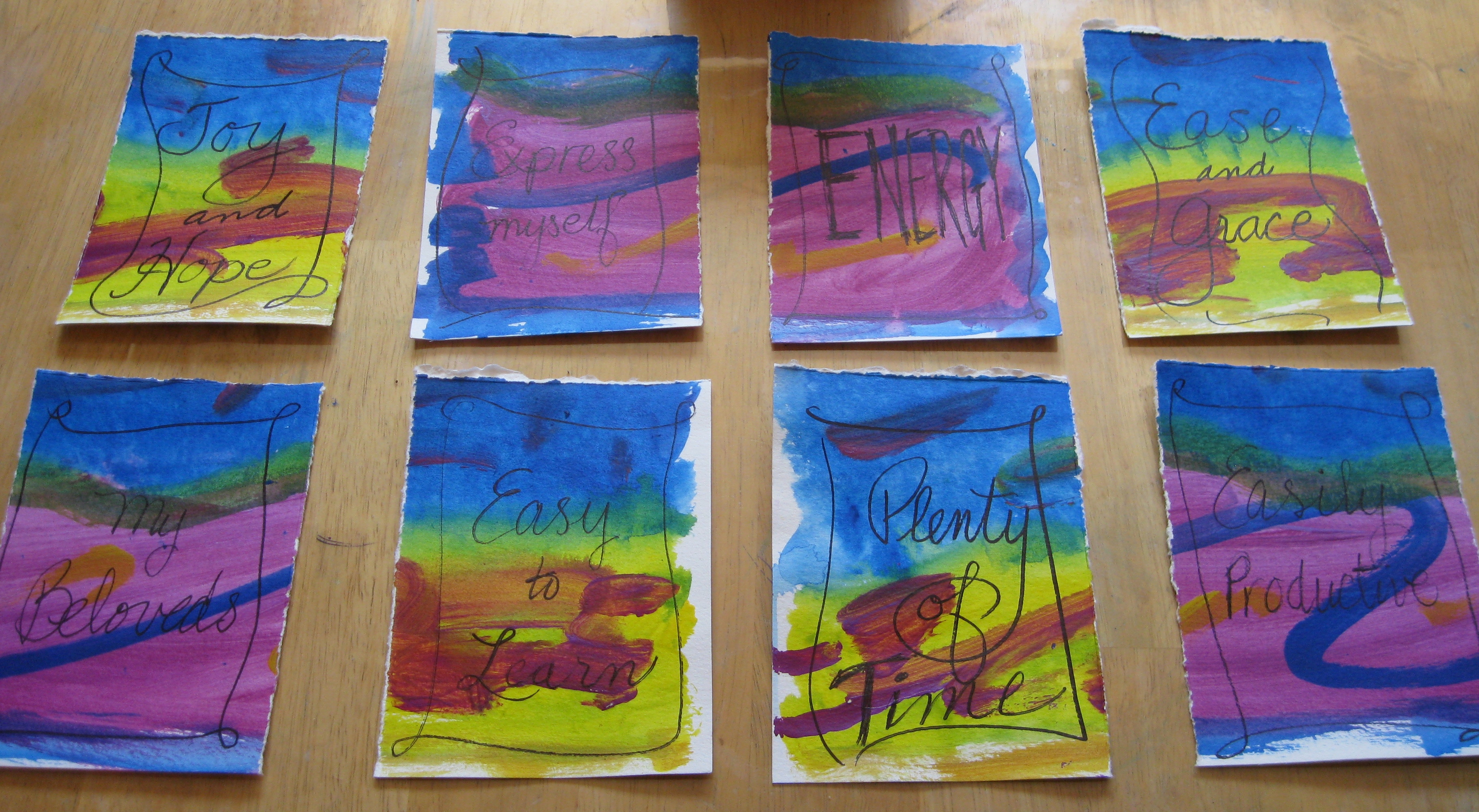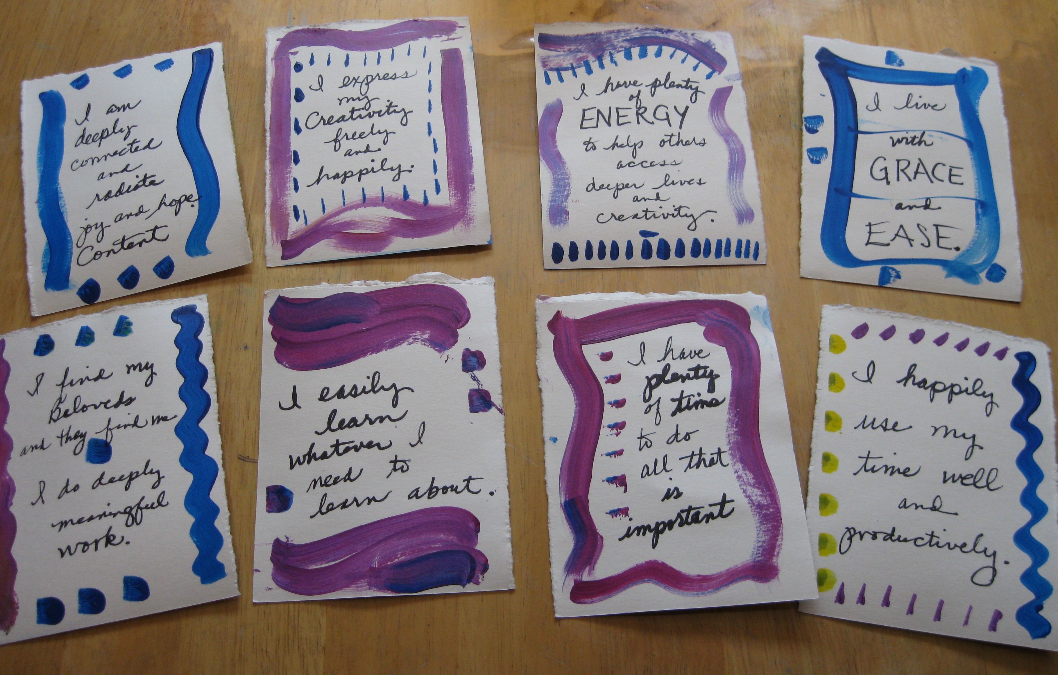 You will create 8 to 12 colorful personalized affirmation cards that will help your inner world support your deepest aspirations.  Alternatively, these cards can be filled with scriptural or wisdom quotations.  These cards will help silence your inner critic, and will give you motivation to do that which is most important to you.  You will leave with your own set of individual talismans of positivity and possibility.