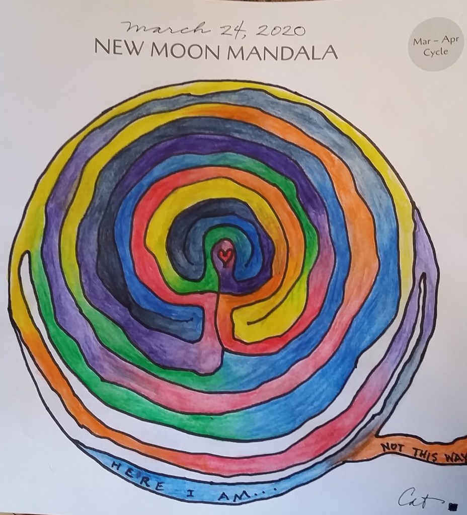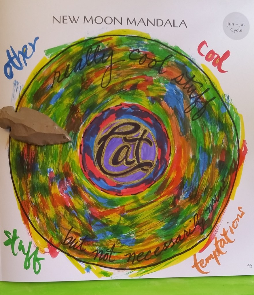 At the beginning of most lunar months, I not only start a new journal, but create both a mandala and an affirmation for something that I want to grow as the moon itself is waxing. At the Full Moon of most months, I create a different affirmation, for letting go of whatever needs to be dropped as the moon wanes. This month I put into visual form how I’m experiencing my life: there is so much abundance, starting with the colors of green exploding all around me, to the pictures and memes on my FB and other internet feeds, to the posts of so many dear friends attempting to support justice for all peoples in this time where we must remind others that Black Lives Matter; Indigenous Lives Matter. Yes.