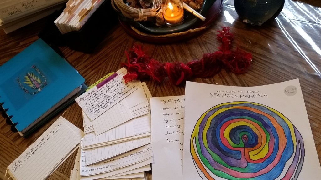 At around noon today we moved into the New Moon. My journal for this Lunar Month is filled with orange papers with a side of yellow for this probably hottest month of 2020. 2020 — the year we won’t forget! For me, there are two aspects of the Social Distancing mandate of Covid 19 that have messed with my groove: both trainings that I would have had with Dr. Clarissa Pinkola Estes in June and October have been cancelled, and the ubiquitous presence of the video conferencing app “zoom”. Considering how others have been seriously inconvenienced or harmed with the whole coronavirus, though, my family has been very fortunate.