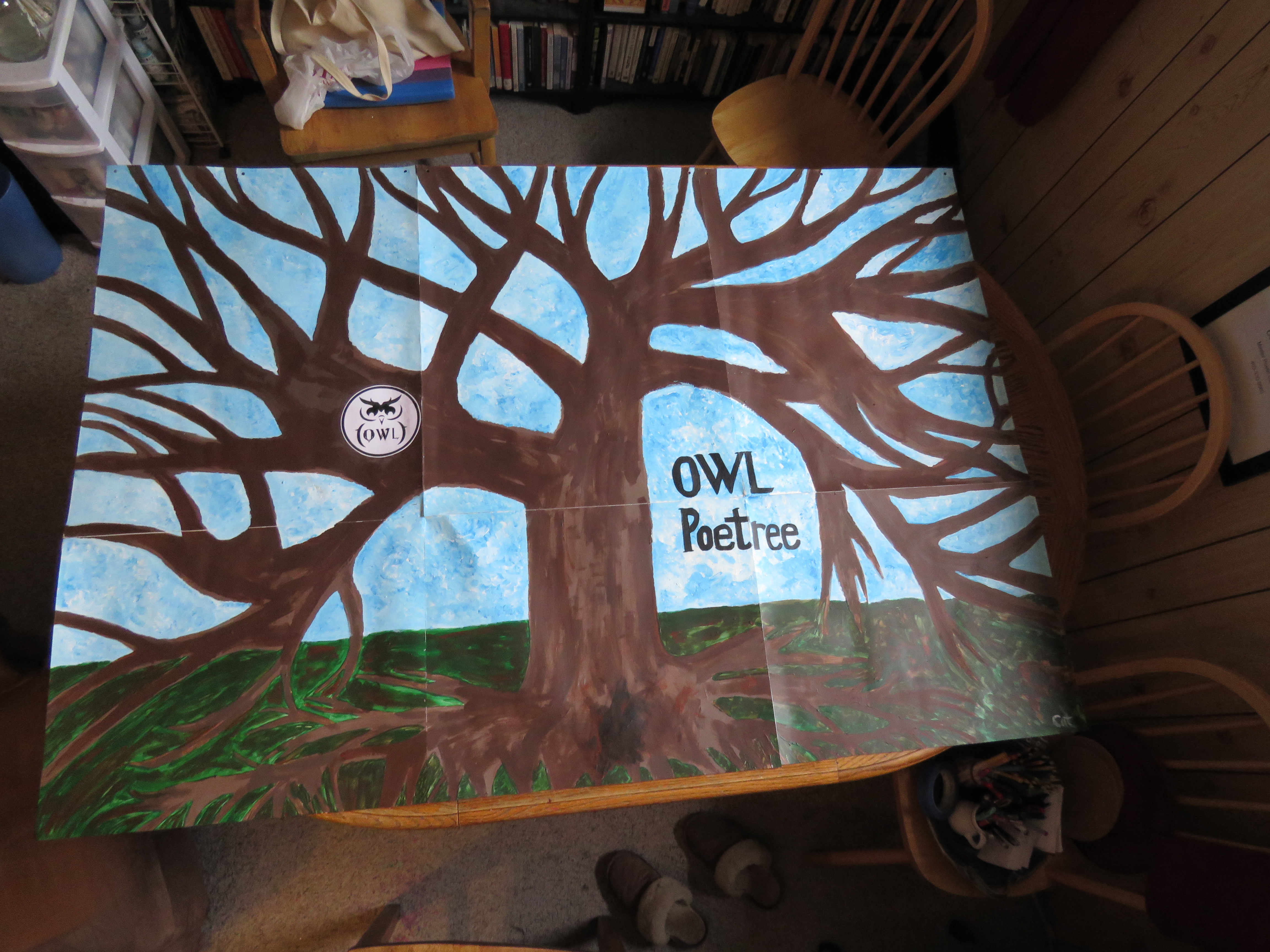 So in honor of the anniversary, I put together a “Poetree”, painting of a tree with bare branches, whose leaves were left on all the tables with an invitation for people to write out what they love about poetry or about OWL Poetry. Then they taped their leaves to the tree, making a beautiful full tree. (The photo here is of the bare branches b/c I don’t yet have a photo of the fully leafed tree —- the double sided tape didn’t work as well as I had hoped it would, and I’m in the process of gluing those leaves down —- 2 hours today, with only about 1/2 done so far!)