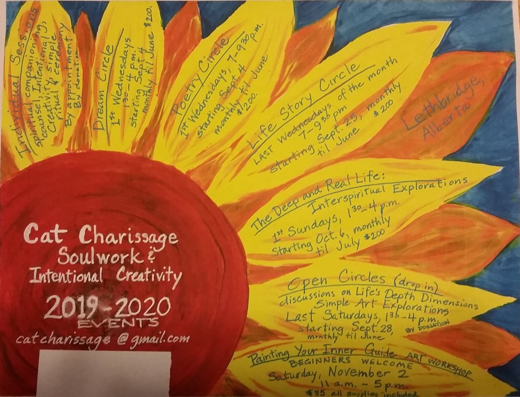 Every fall I offer several opportunities for that kind of conversation to unfold in various Story Circles which meet once per month from September to June. We meet in my home studio, so the size of each group is limited to 8 maximum. This year the various topics include Poetry, Dreamwork, Life Stories (memoir), and Interspiritual Explorations. (I also offer individual sessions, in person or online.)